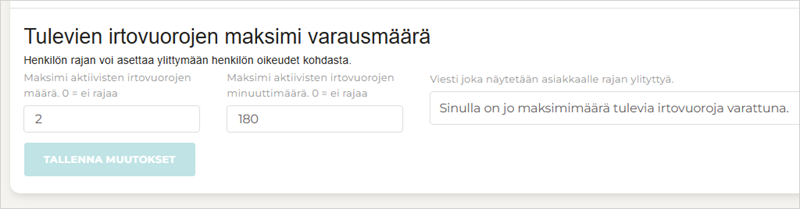 2. Aseta varausten suurin sallittu kappalemäärä ja/tai yhteiskesto minuutteina